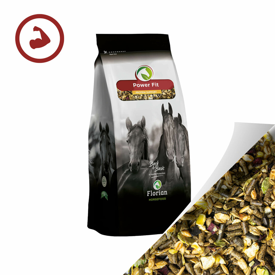 De Power Fit is een uitgebalanceerde Support Mix, met veel eiwit van hoogwaardige kwaliteit. De Power Fit is hoog in eiwit met daarbij extra Vitamine E en biotine toegevoegd. De mix bevat daarnaast ook energie uit koolhydraten, wat zorgt voor extra kracht en bruikbare energie. Deze supportmix is zeer geschikt voor jonge paarden, paarden in de sport die extra spieren moeten opbouwen of oudere paarden met een hogere eiwitbehoefte.