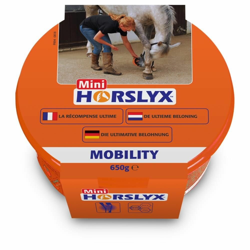 Horslyx Mobility Mini. Ondersteunt gezonde gewrichten. Mini Horslyx: de ultieme beloning. Mini Horslyx is een welkome afleiding bij knippen, scheren, vangen, laden, voor rek- en strekoefeningen, tijdens bezoek van de veearts of hoefsmid of gewoon als lekkere beloning. Horslyx is een aanvulling op het voer voor alle paarden, pony’s en ezels.